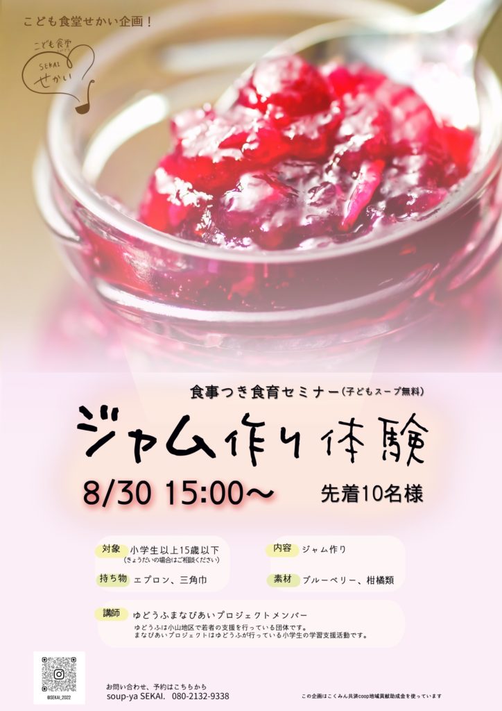 2025年8月18日 / 最終更新日 : 2025年8月18日 管理者ゆどうふ お知らせ 8月30日(土)すーぷやSekaiさん主催の食育プログラムで「ジャムづくり体験」を実施します。 コメントを残す コメントをキャンセルメールアドレスが公開されることはありません。 ※ が付いている欄は必須項目ですコメント ※ 名前 ※ メール ※ サイト 次回のコメントで使用するためブラウザーに自分の名前、メールアドレス、サイトを保存する。 Δ