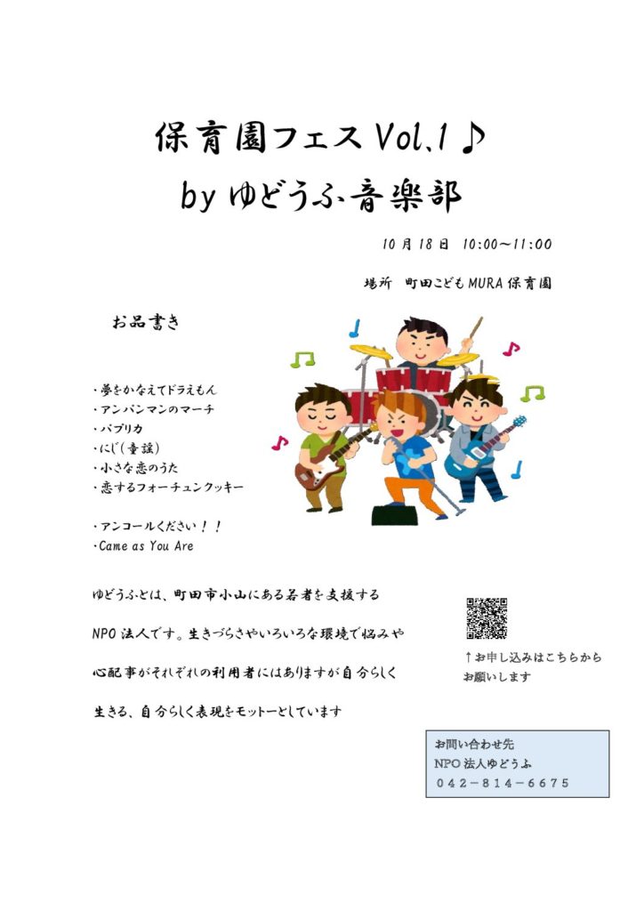 2025年10月1日 / 最終更新日 : 2025年10月6日 管理者ゆどうふ お知らせ 10/18(土)町田こどもMURAにて「保育園Fes」を行います ゆどうふの若者、ボランティアで組んだ音楽部が町田こどもMURAさんで1時間ほど演奏させていただきます。ぜひいらしてください!町田こどもMURAhttps://kodomo-mura.com/ コメントを残す コメントをキャンセルメールアドレスが公開されることはありません。 ※ が付いている欄は必須項目ですコメント ※ 名前 ※ メール ※ サイト 次回のコメントで使用するためブラウザーに自分の名前、メールアドレス、サイトを保存する。 Δ