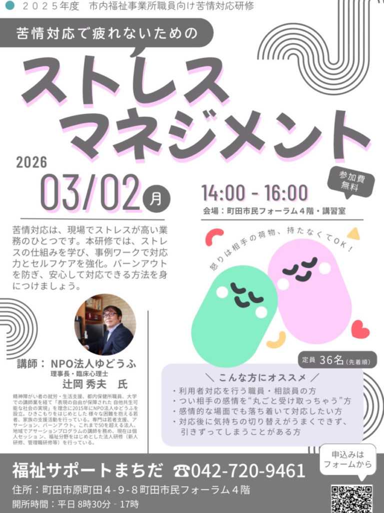 2026年2月7日 / 最終更新日 : 2026年2月7日 管理者ゆどうふ お知らせ 3月2日(月)町田市内福祉事業所職員向け研修「ストレスマネジメント」を実施します。 参加申し込みはチラシQRコードよりお願いいたします(先着36名となっています)。 Screenshot コメントを残す コメントをキャンセルメールアドレスが公開されることはありません。 ※ が付いている欄は必須項目ですコメント ※ 名前 ※ メール ※ サイト 次回のコメントで使用するためブラウザーに自分の名前、メールアドレス、サイトを保存する。 Δ