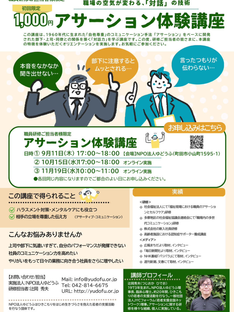 神奈川県社会福祉協議会様主催の「アサーション研修」にて代表が講師を務めます(Aコース=9月、Bコース=11月に実施)